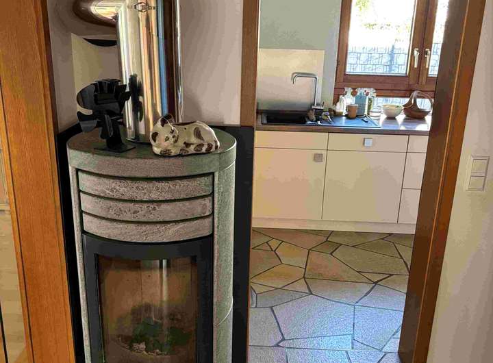 EG:( Parkettboden, Natursteinboden),Einbaugarderobenschrank, Kaminofen.