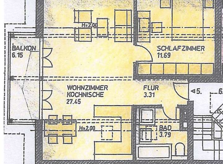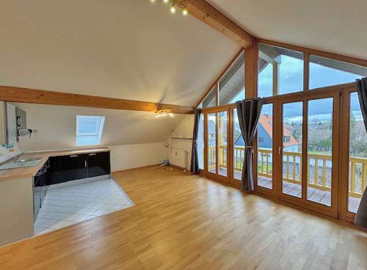 Wohnfläche 49,3 m2, Nutzfläche durch Schrägen ca. 64 m2.