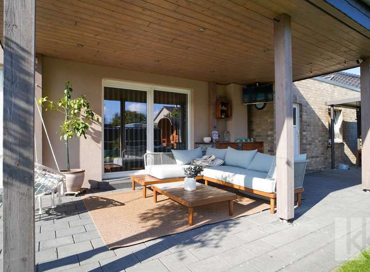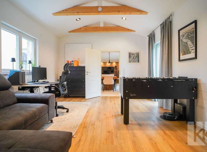 Vom Wohnbereich aus führt der Weg in einen Anbau, der flexibel als Homeoffice, Gästezimmer oder kreativer Rückzugsort genutzt werden kann. Von dort gelangen Sie direkt in den Garten und auf die teils überdachte Terrasse – der perfekte Ort für entspannte Stunden mit Familie und Freunden.