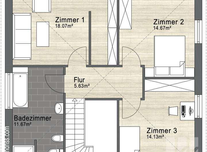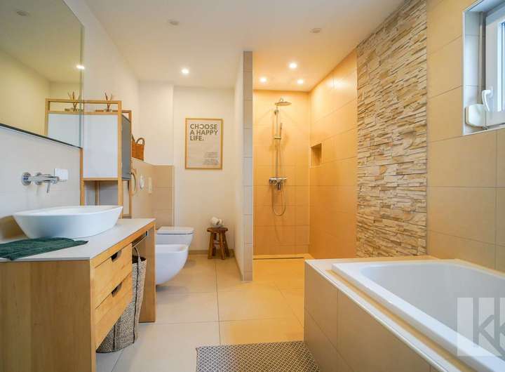 Im Obergeschoss erwarten Sie drei helle Schlafzimmer sowie ein großzügiges Tageslichtbad mit Badewanne, Dusche, Bidet und WC – ein privater Rückzugsort für kleine Wellnessmomente. Der Spitzboden bietet zusätzlichen Stauraum.
