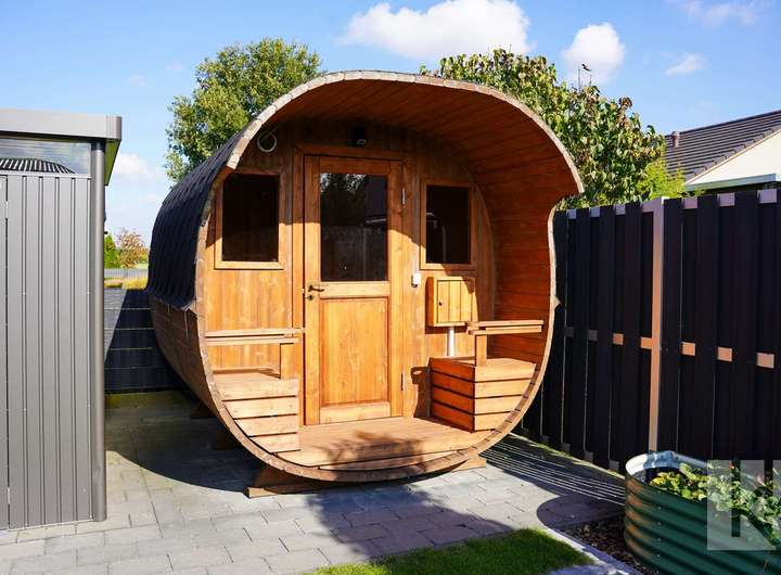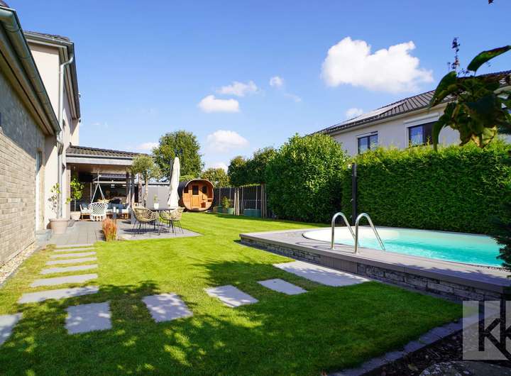 Der liebevoll gestaltete Garten mit Terrasse, Fasssauna und beheizbarem Pool schafft eine private Wohlfühloase, die zum Entspannen und Genießen einlädt.