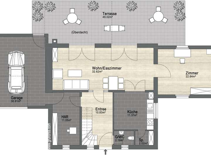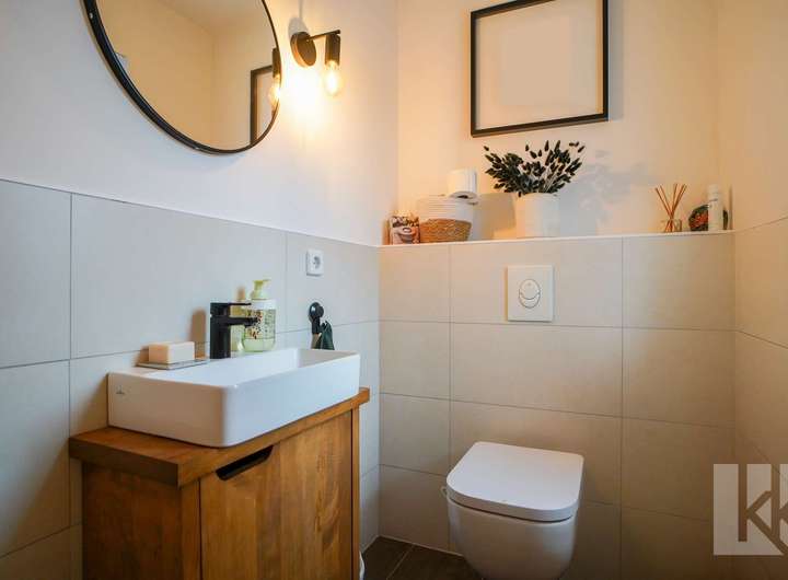 Ein Gäste-WC mit Tageslicht sowie ein Hauswirtschaftsraum mit direktem Zugang zur Garage ergänzen das Erdgeschoss auf praktische Weise.