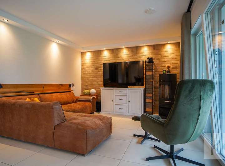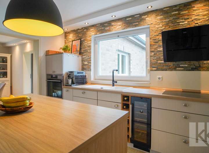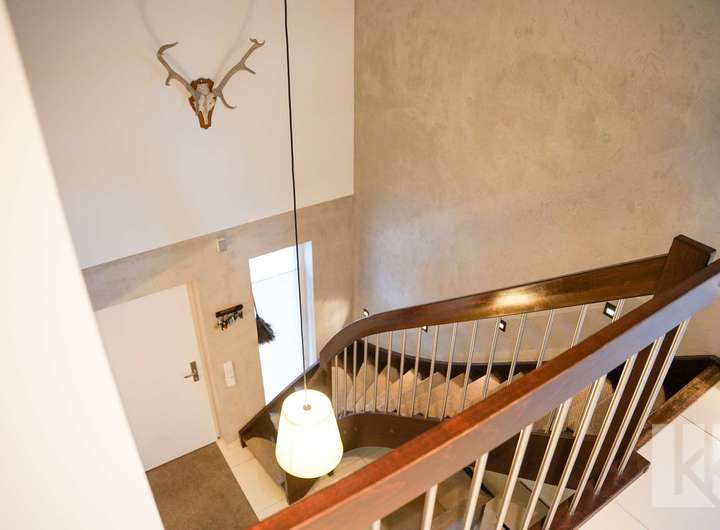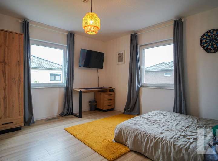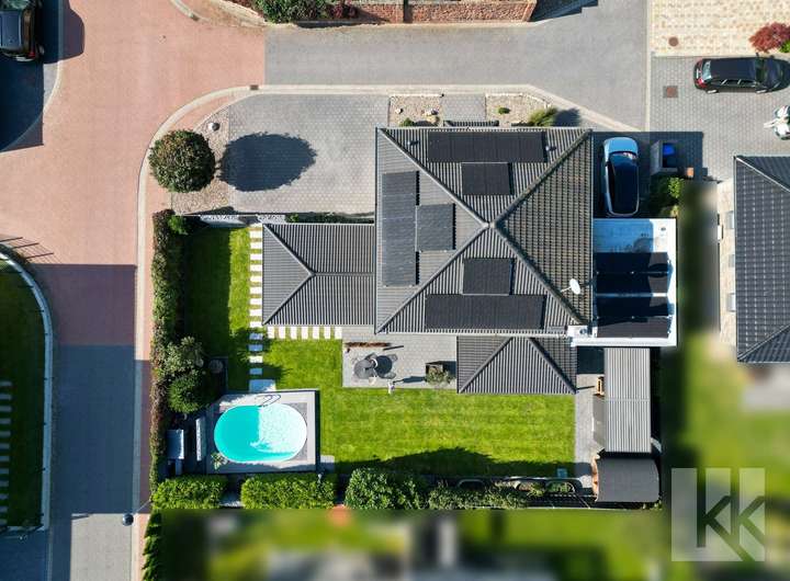 Auch technisch überzeugt die Immobilie: Das Haus entspricht dem KfW-70-Standard, wird über eine effiziente Luftwärmepumpe beheizt und verfügt in allen Räumen – mit Ausnahme des Anbaus und des Hauswirtschaftsraums – über eine Fußbodenheizung. Eine Photovoltaikanlage von 2021 mit 10,04 kWp und 7,7 kW-Speicher unterstützt die Energieversorgung nachhaltig. Dreifach verglaste Fenster, elektrische Außenrollläden, eine Garage, vier Stellplätze und Glasfaserinternet runden das Angebot ab.