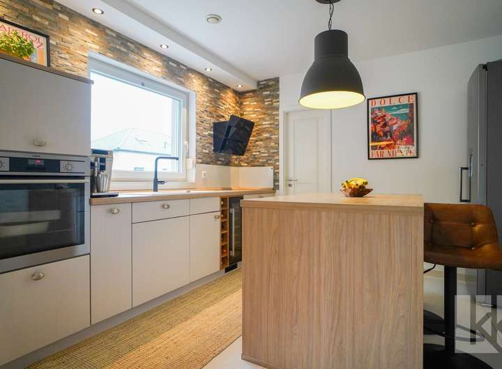 Die angrenzende Küche überzeugt durch eine durchdachte Planung und bietet zusätzlich einen separaten Vorratsraum – ideal für alle, die Freude am Kochen haben. Auf Wunsch lässt sich der Wohn- und Essbereich durch eine Wand oder eine Flügeltür von der Küche abtrennen.