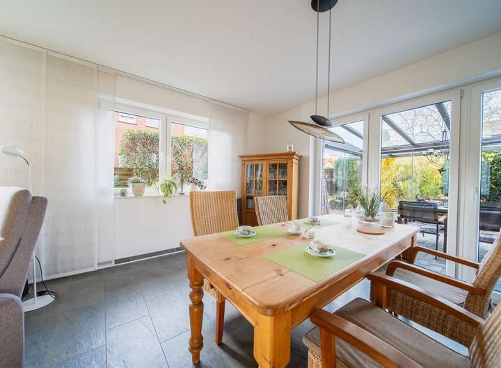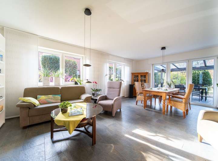 -Fußbodenheizung im Wohnbereich (EG); Fliesen in Flur (EG), Küche, Bad, Gäste-WC, Wohnzimmer und HWR; Wohn-/Schlafräume mit pflegeleichten Teppichböden
