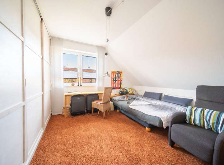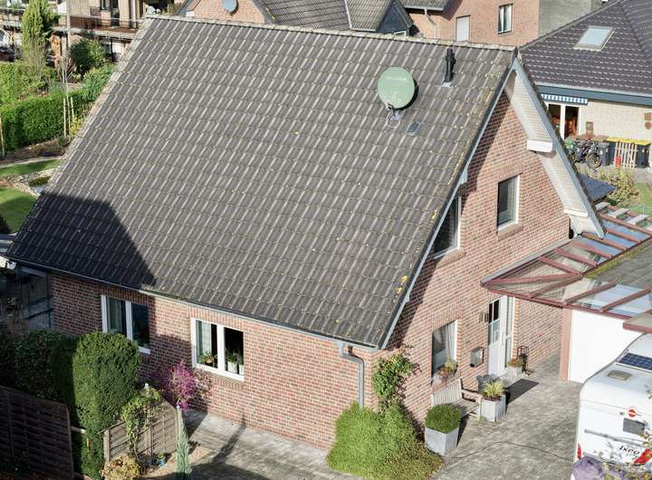 Dach: geneigtes Dach mit Betondachziegeln (Nelskamp), Folie & Konterlattung; Zwischensparrendämmung ca. 18 cm; Dachrinnen und Fallrohre in Zink; Spitzboden nicht ausgebaut