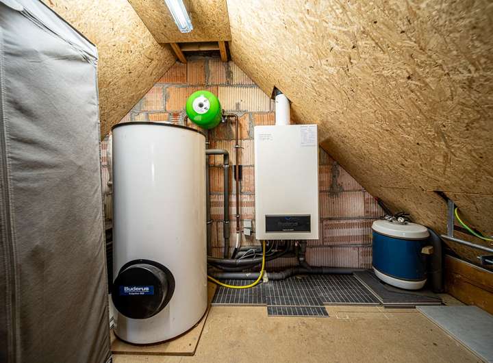 -Buderus-Gas-Brennwerttherme (Außenwandgerät von 2007) im DG, Warmwasser über 160 l Speicher