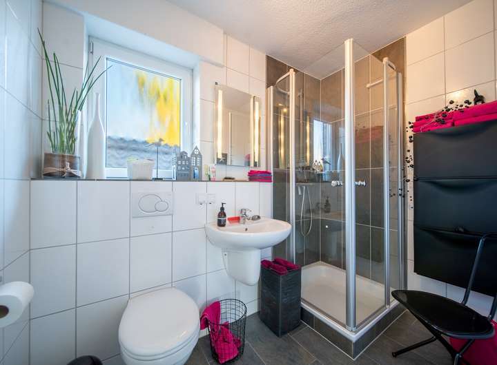 -Gäste-WC (EG): vergrößert mit zusätzlicher Dusche und Handwaschbecken, deckenhoch gefliest