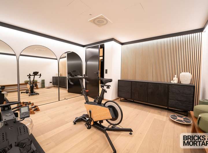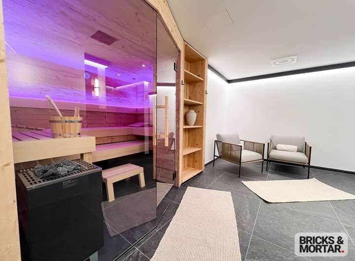 Wellnessbereich mit hochwertiger Sauna, Dusche und Liegebereich, Private Lounge mit Tee-Küche, eigenes Kino, Fitnessraum, WC, Skiraum und Schleuse zur TG