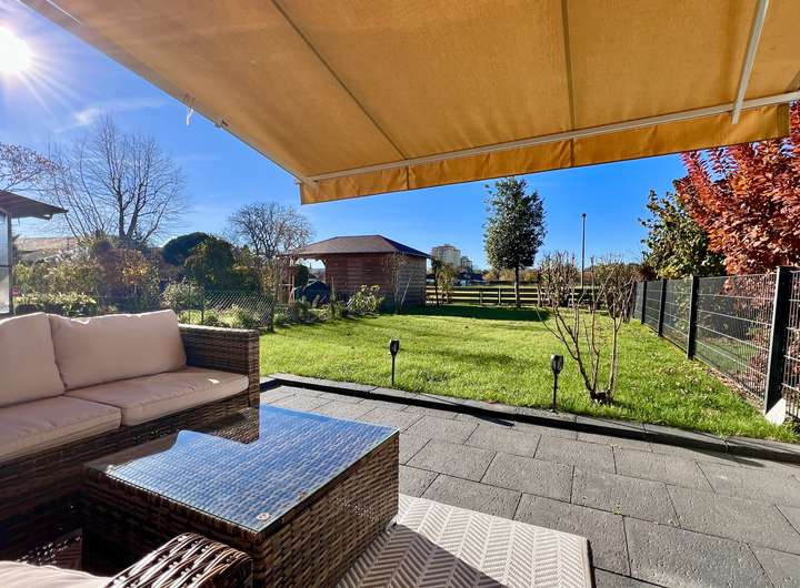 Im Erdgeschoss befinden sich ein heller Eingangsbereich, ein Gäste-WC, eine abgetrennte Küche mit Fenster sowie ein Wohnzimmer mit Zugang zur Terrasse und zum großen, eingezäunten Garten – ideal für Familien.