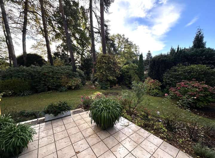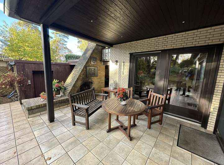 Der einladende Wohn- und Essbereich mit Parkettboden hat Zugang zur teilweise überdachten Terrasse mit Kamin. Der herrliche Blick in das naturnahe, bewaldete Grundstück – ein Ort zum Entspannen und Genießen.