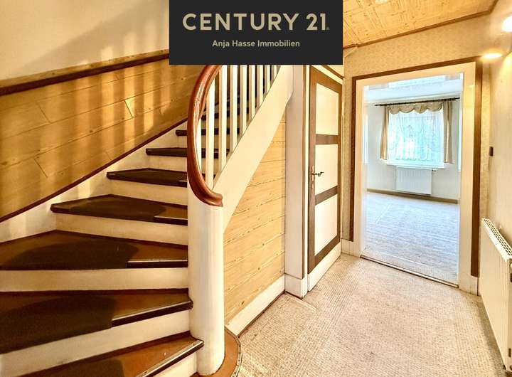 Das ausbaufähige Dachgeschoss bietet zusätzliche Gestaltungsmöglichkeiten. Eine freistehende Garage sowie eine kleine Garage im Anbau runden das Angebot ab.
