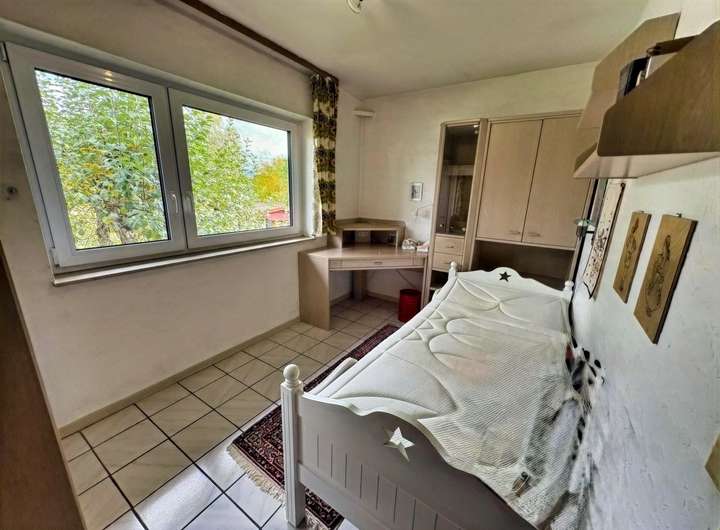 Im EG befinden sich neben der Küche mit Essplatz, ein Wohn-/Esszimmer, ein Badezimmer, ein Schlafzimmer, ein Kinderzimmer und ein Büro.