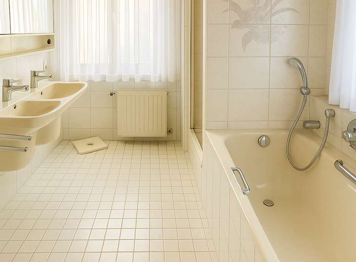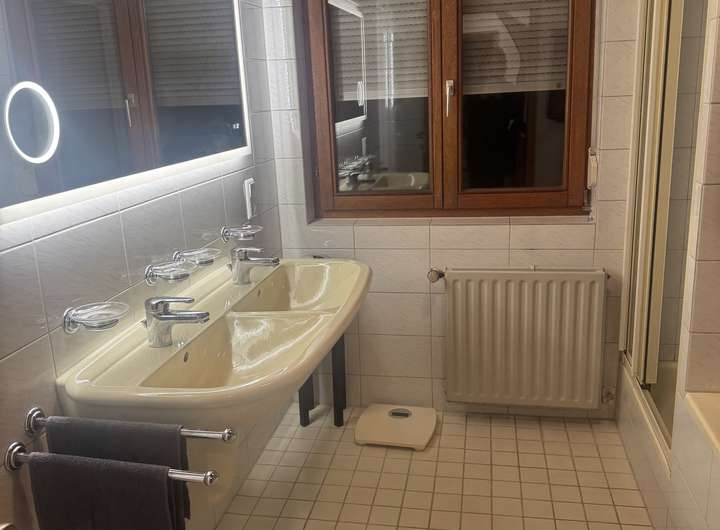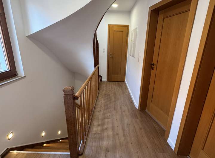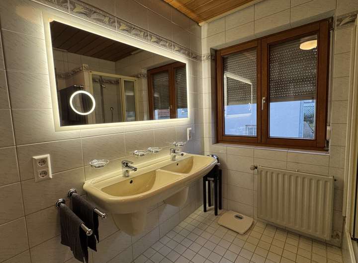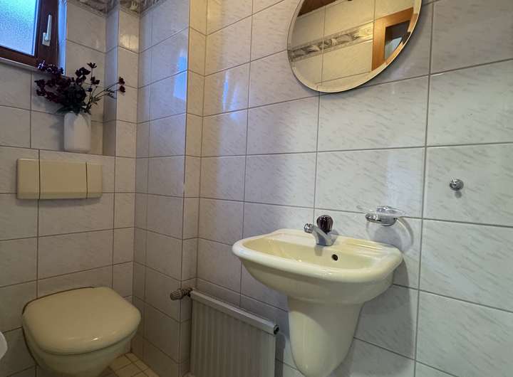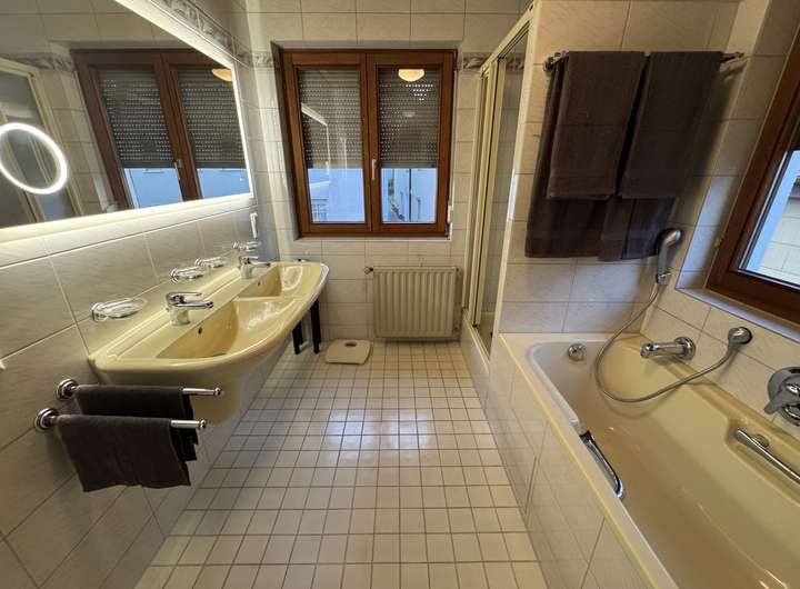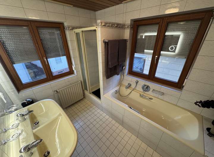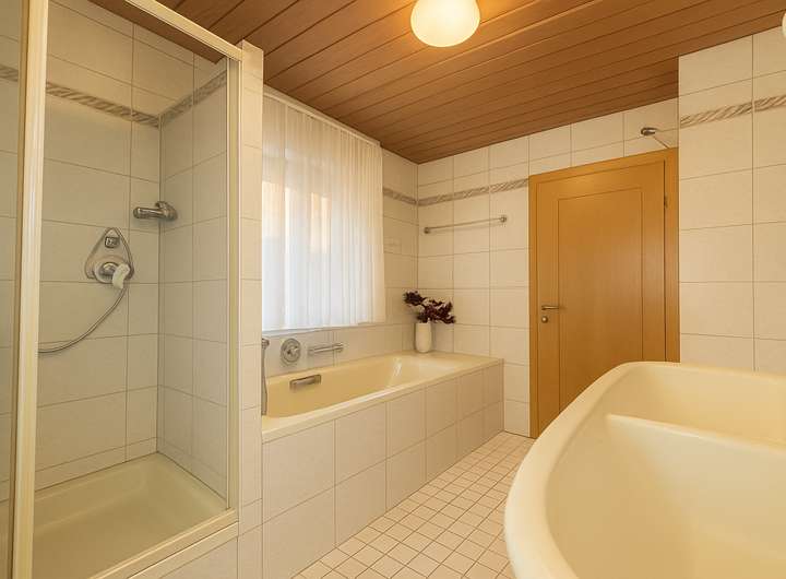 Das große Tageslichtbad im 1. Obergeschoss ist mit Badewanne und Dusche ausgestattet. Zusätzlich gibt es zwei separate WCs sowie ein weiteres Duschbad im Untergeschoss. Ein vollständig sanierter, gedämmter und vielseitig nutzbarer Weinkeller rundet das Raumangebot ab.