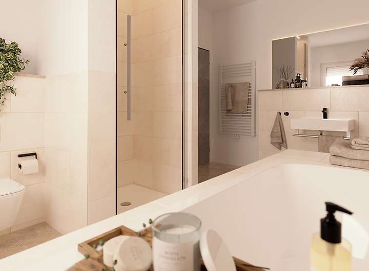 In der Küche haben Sie genug Platz für gemeinsame Kochabende mit den Liebsten oder ein schnelles Frühstück unter der Woche. Wer hin und wieder lieber im Home-Office arbeitet, kann sich neben dem Wohnzimmer ein Arbeitszimmer einrichten.