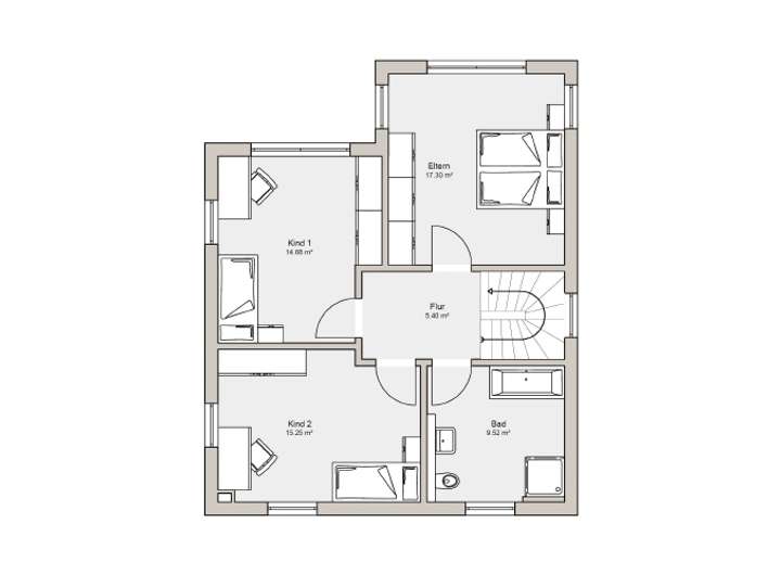 In das Obergeschoss führt eine u-förmige Treppe. Hier befinden sich zwei Kinderzimmer und ein geräumiges Elternschlafzimmer. Im Obergeschoss befindet sich außerdem das großzügige Familienbad.