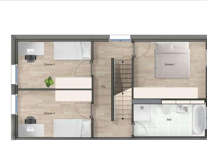 Der offene Wohn- und Essbereich schafft im Erdgeschoss eine helle, kommunikative Mitte. Große Fensterflächen lassen viel Tageslicht herein und sorgen für ein luftiges Raumgefühl. Die Galerie im Dachgeschoss eröffnet neue Perspektiven – ideal als Homeoffice oder Rückzugsort.