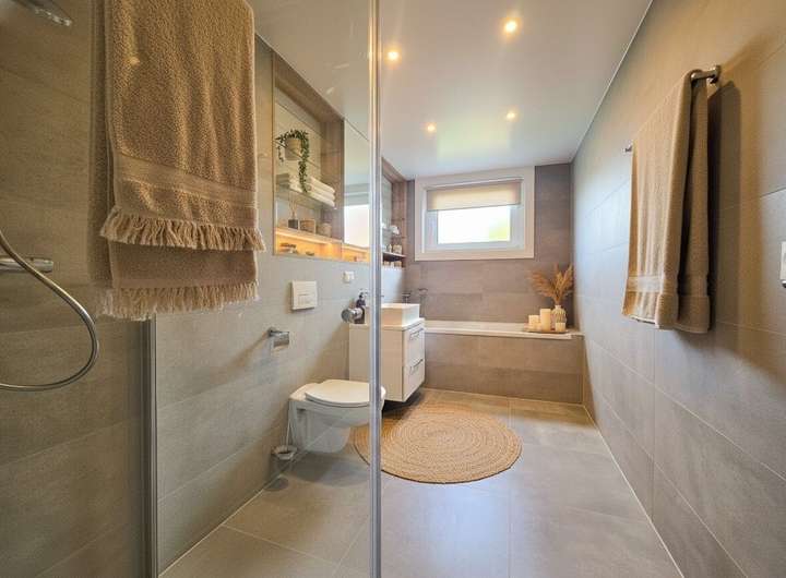Design trifft Funktion: Das elegante Bad mit bodengleicher Dusche und Wanne, die stilvolle Holzdecke sowie praktische Details wie Gäste-WC, Abstellmöglichkeiten und Stellplätze machen dieses Haus zu einem echten Wohlfühlhaus.