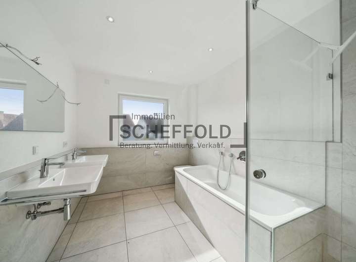 Das Tageslichtbadezimmer im Obergeschoss spiegelt die modernen und hochwertigen Standards des Hauses wider. Es ist ausgestattet mit bodengleicher Dusche, Badewanne, stilvollen Fliesen und eleganten Armaturen – der perfekte Ort, um sich täglich wohlzufühlen.