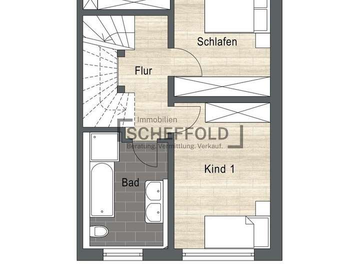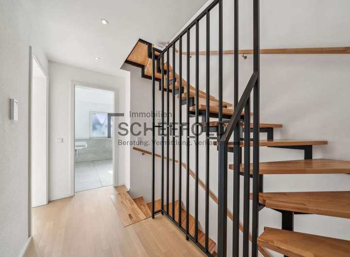 Über die stilvolle Treppe gelangen Sie in das Obergeschoss, das mit seiner optimalen Raumaufteilung überzeugt. Das Elternschlafzimmer ist großzügig geschnitten und wird durch eine praktische Ankleide ergänzt, die zusätzlichen Stauraum schafft. Ein weiteres Zimmer eignet sich ideal als Kinder- oder Gästezimmer.