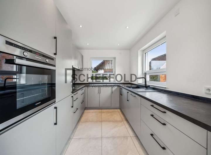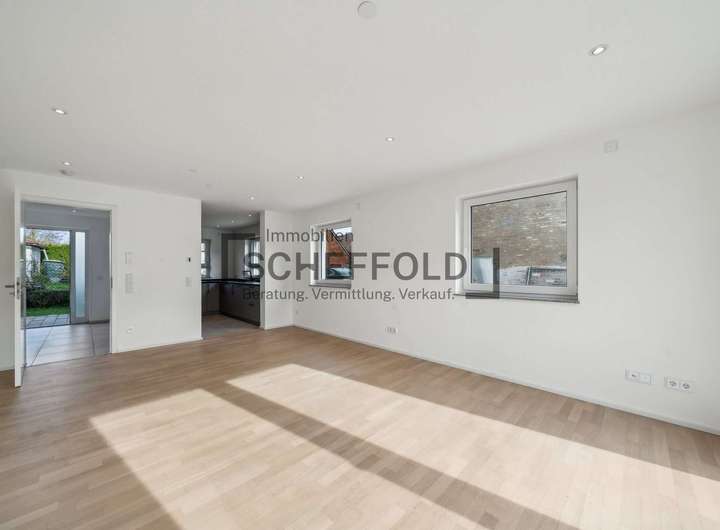 Große Fensterflächen schaffen eine helle und einladende Atmosphäre, während der direkte Zugang zur sonnigen Terrasse und dem Garten ein Gefühl von Freiheit und Ruhe vermittelt. Die perfekt integrierte Einbauküche ermöglicht kurze Wege und gemeinsames Kochen mit Familie und Freunden – ideal für gesellige Abende und gemütliche Stunden.