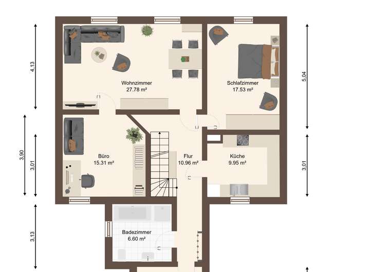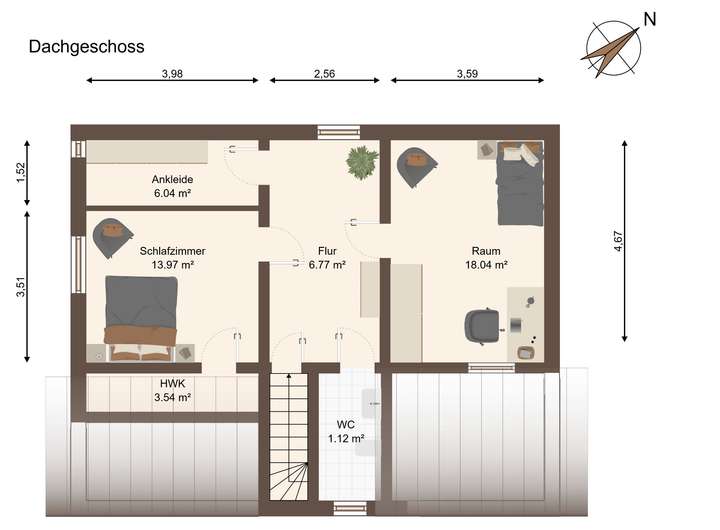 Im Dachgeschoss finden Sie gemütliche Schlafzimmer, eine Ankleide und zusätzlichen Stauraum. Ein Teilkeller bietet praktische Flächen für Waschküche, Technik oder Vorräte.