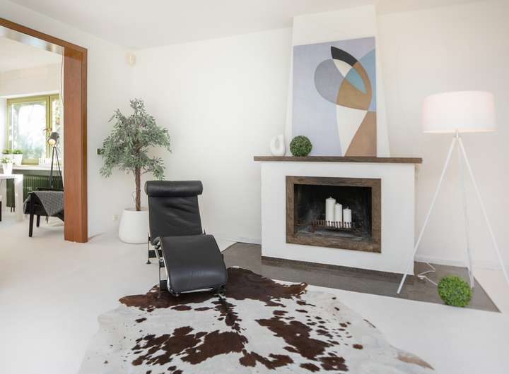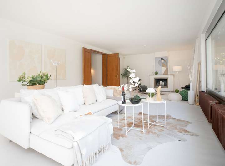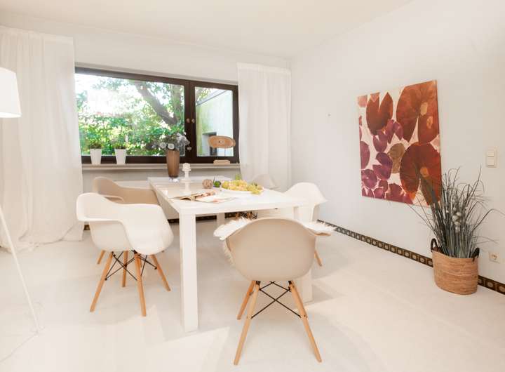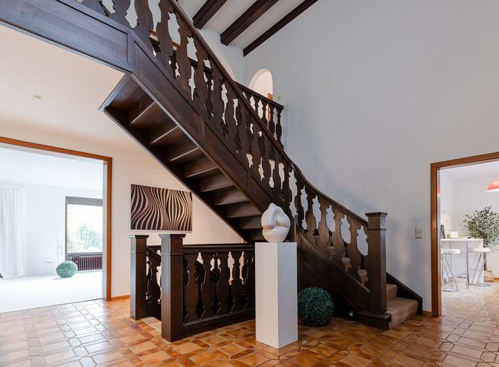 Schon beim Betreten des Hauses beeindruckt die einladende Eingangsdiele mit dem offenen Treppenhaus, das dem Raum Großzügigkeit und Charakter verleiht. Vom großen Wohnzimmer aus hat man einen schönen Ausblick in den Garten und die umgebende Natur. Angrenzend befinden sich eine separate Küche und ein separates Esszimmer. Hier besteht die Möglichkeit, alles zu einem modernen, offenen Wohn-/Essbereich zu verbinden.