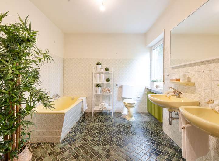 Im Obergeschoss erwarten Sie aktuell fünf Zimmer und zwei Tageslichtbäder, darunter ein Vollbad und ein Duschbad. Somit bietet das Haus genügend Platz für eine große Familie, ein Homeoffice oder Gäste.