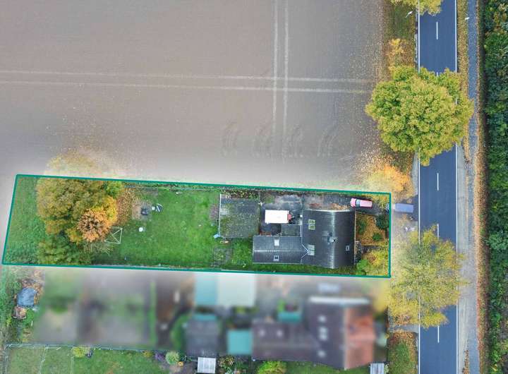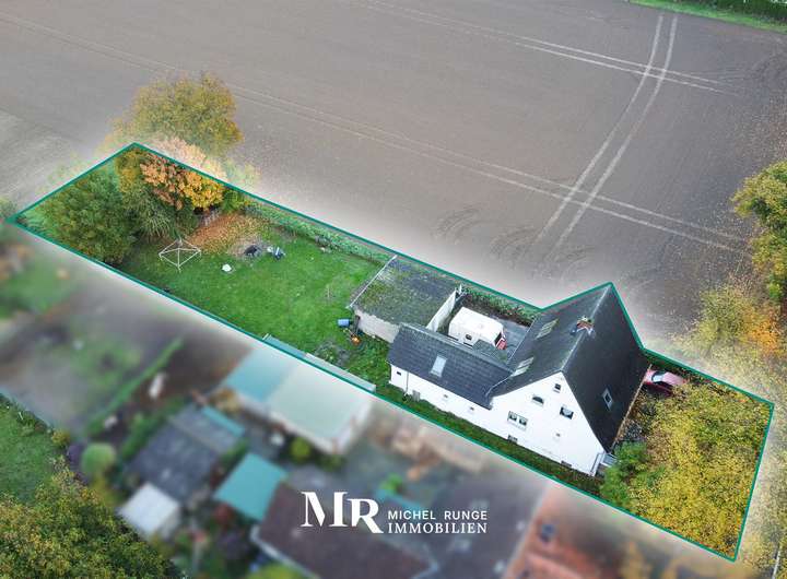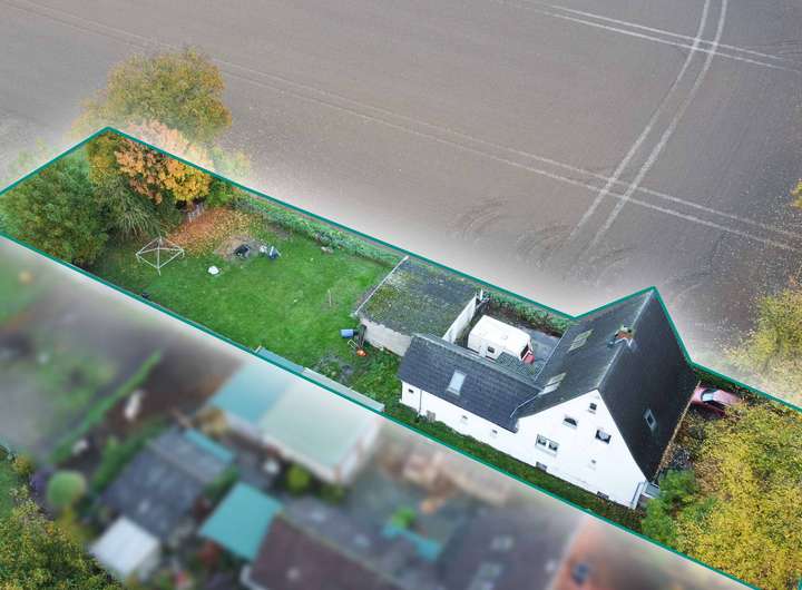 Die Immobilie umfasst ein großzügiges Grundstück von insgesamt ca. 900 qm. Direkt hinter dem Haus befindet sich ein gepflasterter Bereich sowie die Doppelgarage. Die daran anschließende Grünfläche mit Rasen und Bäumen lädt zum Entspannen ein und bietet einen herrlichen Blick in die Weite der angrenzenden Felder.