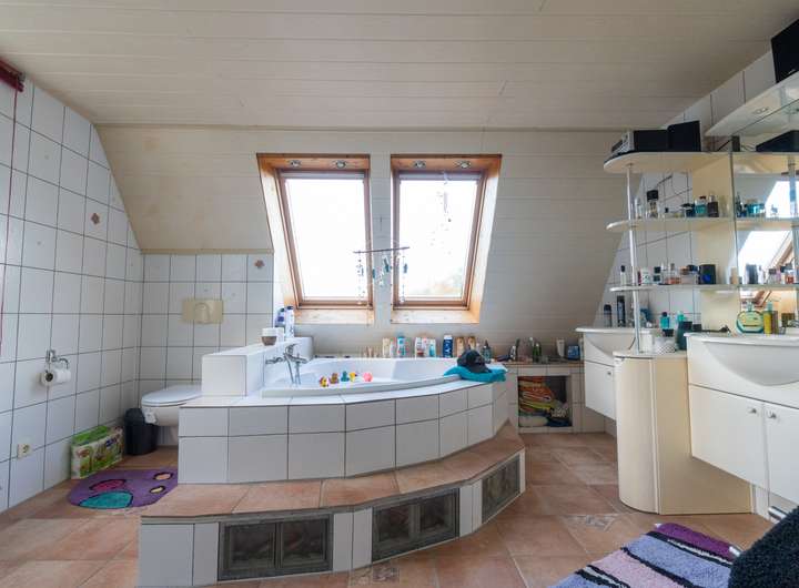Das großzügige Badezimmer ist dank der Dachflächenfenster und eines zusätzlichen Fensters lichtdurchflutet. Es bietet umfassenden Komfort mit zwei Waschtischen, einer Dusche, einer einladenden Eckbadewanne und einem WC.