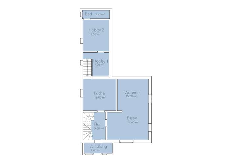 Ein praktischer Windfang schützt den Eingangsbereich vor Regen und führt direkt in den Flur. Von hier erreicht man alle Räume des Erdgeschosses. Auf der linken Seite führt eine Treppe zum Dachgeschoss. Der Flur bietet genügend Platz für eine Garderobe. Unter der Treppe befindet sich eine praktische, abgeschlossene Abstellkammer.