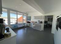 Der Wohnbereich besticht durch große Fensterfronten. Die Küche ist funktional gestaltet und bietet ausreichend Platz für kulinarische Kreationen.