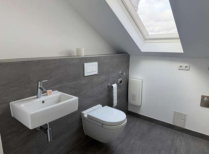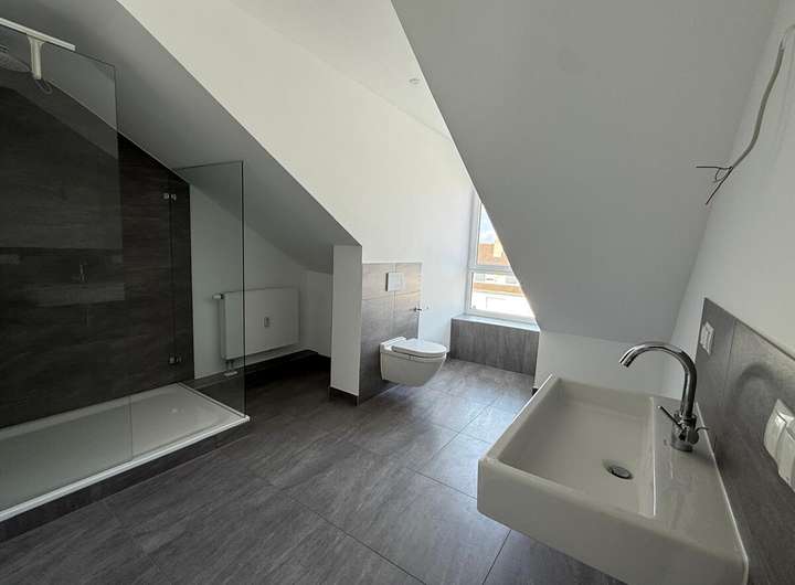 Das Badezimmer ist mit modernen Armaturen ausgestattet und verfügt über eine großzügige Dusche. Ein separates WC ergänzt die sanitären Einrichtungen der Wohnung.