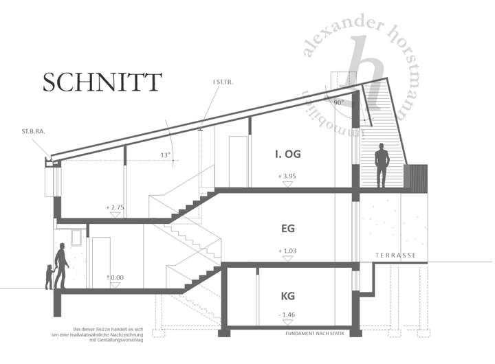 Die Eingangsdiele nebst Garderobe und Gäste-WC teilt sich die erste Ebene mit der Küche und dem vorgelagerten Essplatz, der offen zum nächsten Geschoss gestaltet ist. Über ein paar Stufen gelangen Sie in das große, lichtdurchflutete Wohnzimmer mit seinen gut 30 Quadratmetern üppig dimensioniert. Von hier aus eröffnet sich ein herrlicher Blick über die Terrasse in den schönen Garten.