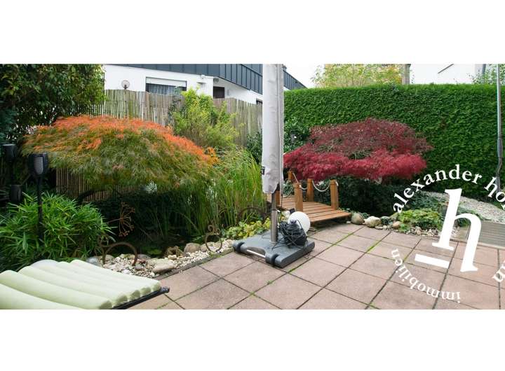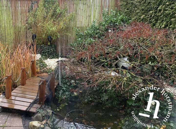 Das mit 200 m² eher kompakte Grundstück bietet einen schön eingewachsenen Garten mit Teich und einer teilüberdachten Terrasse, wo sich der wohlverdiente Feierabend trefflich ausklingen lässt.