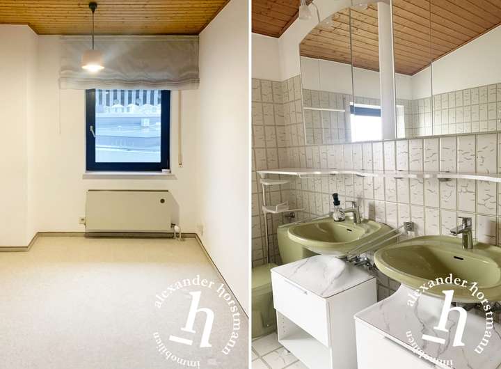 Der privatere Bereich des Hauses beginnt dann eine Ebene höher. Neben dem Dusch- und Wannenbad mit zwei Waschbecken findet sich das erste von zwei Schlafzimmern. Beide Schlafzimmer besitzen eine gute Größe und oben findet sich noch neben dem besagten zweiten Schlafzimmer mit vorgelagerter Loggia ein kleineres Arbeitszimmer und ein praktischer Abstellraum. Im Untergeschoss des Hauses, es ist teilunterkellert, finden