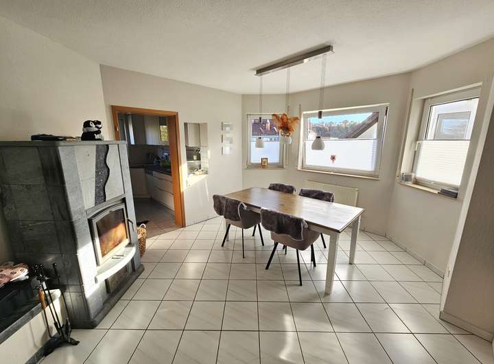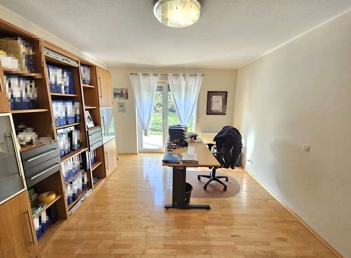 Die Hauptwohnung mit rund 158 m² Wohnfläche empfängt Sie im Erdgeschoss mit einem großzügigen Wohn- und Essbereich, der durch den gemütlichen Kaminofen und den Zugang zur überdachten Terrasse zum Mittelpunkt des Familienlebens wird. Der Blick ins Grüne und der harmonisch angelegte Garten schaffen eine Atmosphäre zum Wohlfühlen. Eine separate Küche, ein Büro, ein Bad sowie praktische Nebenräume wie Vorrats- und Dielenbereiche ergänzen das Raumangebot dieser Ebene.