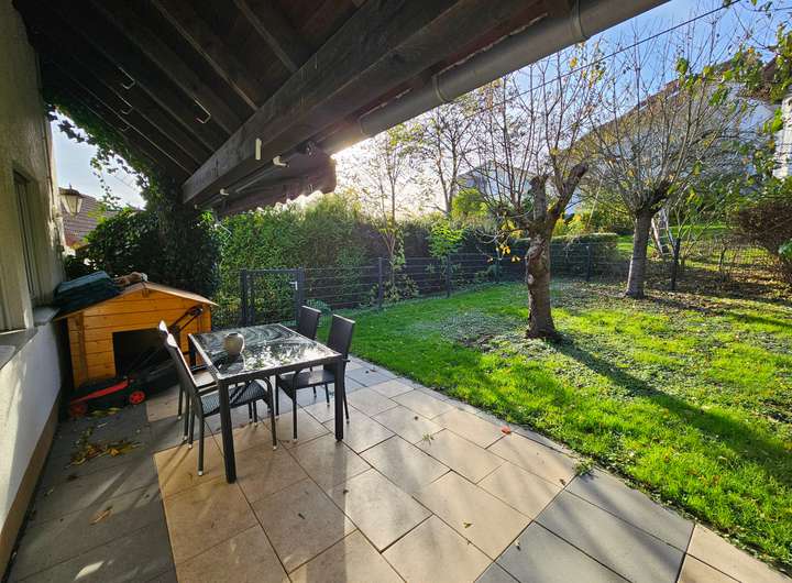 Der Außenbereich überzeugt mit einem eingezäunten Garten, der viel Privatsphäre bietet. Eine überdachte Terrasse, eine Garage und drei Stellplätze runden das Gesamtbild harmonisch ab.