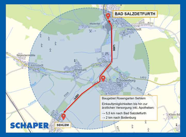 Von Bad Salzdetfurth/Bodenburg kommend (gerade einmal gutee 5 km entfernt) befinden sich 13 attraktive Bauplätze am linken Ortsrand von Sehlem und jene sind mit Ein- bzw. Zweifamilienhäusern bebaubar.