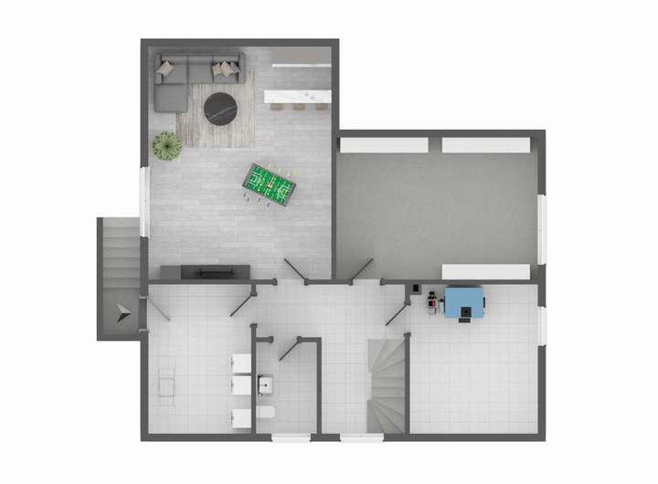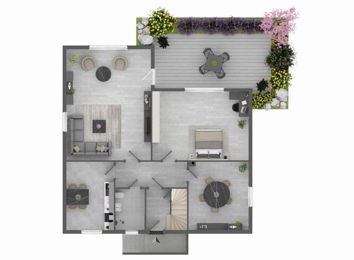 Das Erdgeschoss bietet ein großzügiges Wohnzimmer mit Zugang zur sonnigen Terrasse, eine Küche, zwei vielseitig nutzbare Zimmer und ein Duschbad mit Tageslicht.