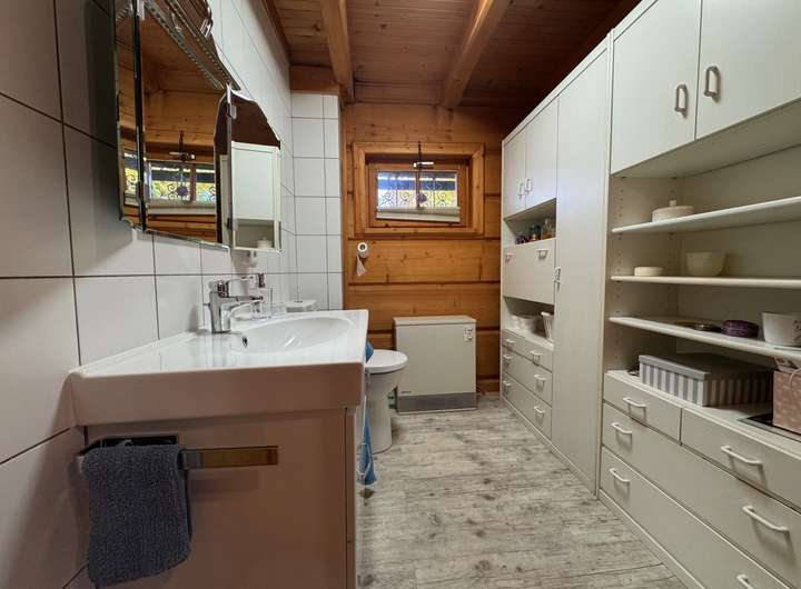 Die Küche ist funktional und zeitlos modern gestaltet. Ein Ort, an dem Kochen und Beisammensein gleichermaßen Freude bereiten. Praktisch ergänzt wird sie durch eine angrenzende Speisekammer mit direktem Zugang zur zweiten Terrasse und in den Garten. Ein Gäste-WC komplettiert das Erdgeschoss.
