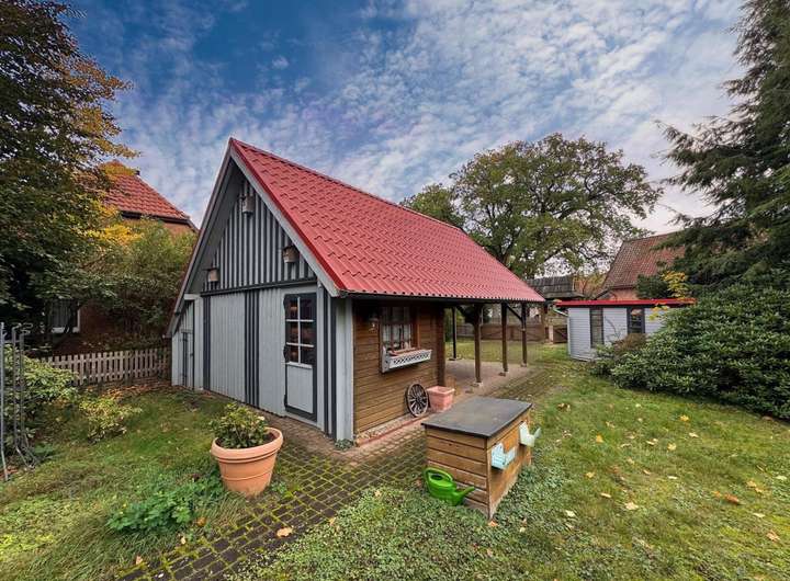Auch die Nebengebäude fügen sich harmonisch ins Gesamtbild ein: Ein separates Haus beherbergt eine Sauna mit Dusche und WC sowie den Hauswirtschaftsraum mit Waschmaschinenanschluss. Über eine Treppe gelangt man hier in das gemütliche Gästezimmer im Dachgeschoss. Ein weiteres Gartenhaus mit abgeteilten Abstellräumen bietet ausreichend Platz für Gartengeräte und Möbel.