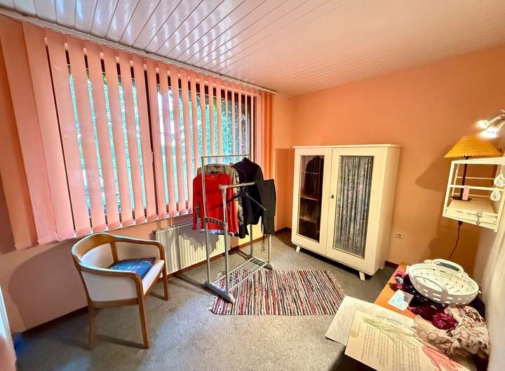 Durch die Küche gelangt man in das gemütliche Esszimmer, das zum gemeinsamen Beisammensein einlädt. Der angrenzende Wintergarten stellt ein besonderes Highlight dar – mit etwas Modernisierung lässt sich hier ein wunderschöner Rückzugsort schaffen. Das Erdgeschoss verfügt zudem über zwei weitere Zimmer, die flexibel als Büro, Gäste- oder Kinderzimmer genutzt werden können. Das Badezimmer wurde barrierearm gestaltet und bietet eine große Walk-in-Dusche, WC, Bidet, Waschbecken sowie ein Fenster. Ein separates Gäste-WC rundet das Raumangebot dieser Etage ab.