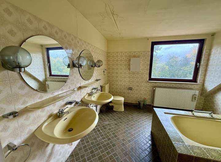 Das Badezimmer im Obergeschoss präsentiert sich gepflegt und verfügt über eine Badewanne, zwei Waschbecken, ein WC sowie ein Fenster.