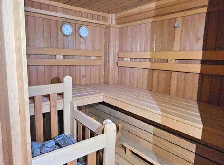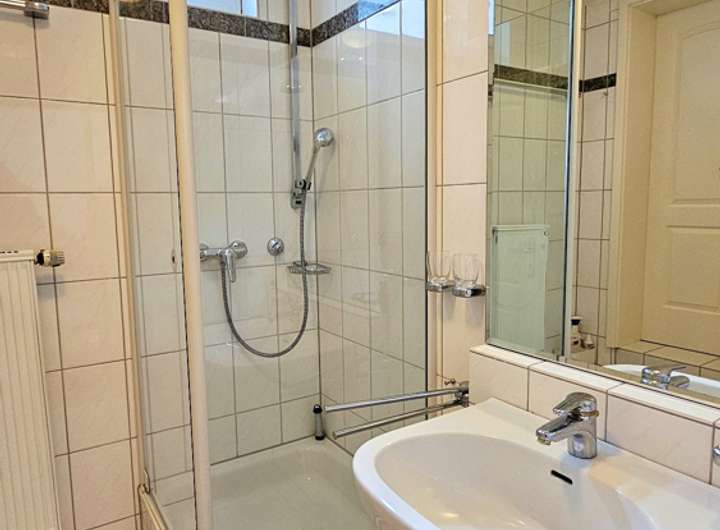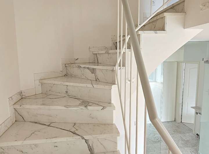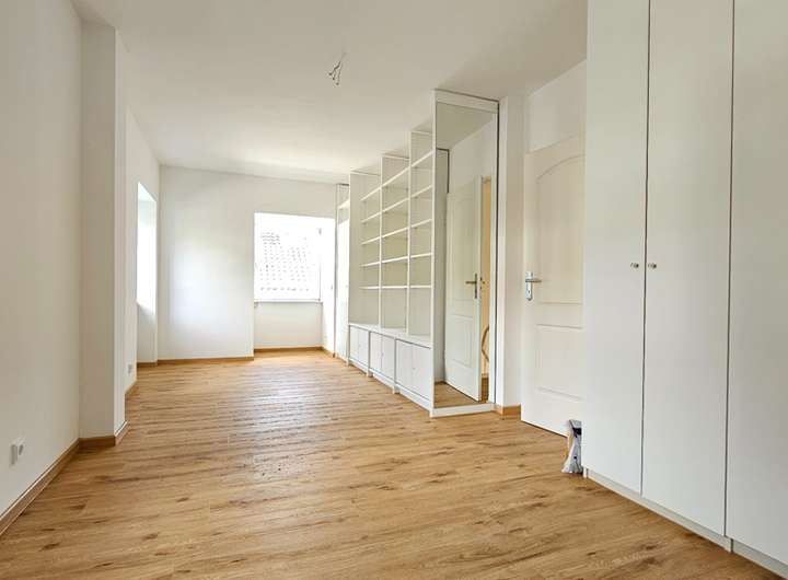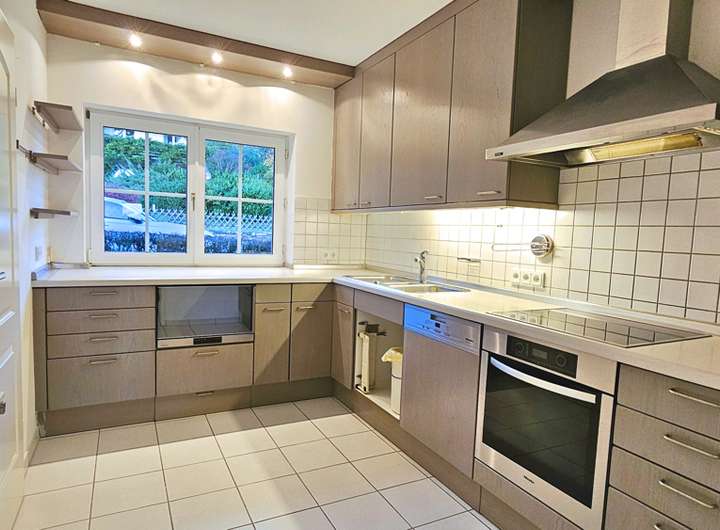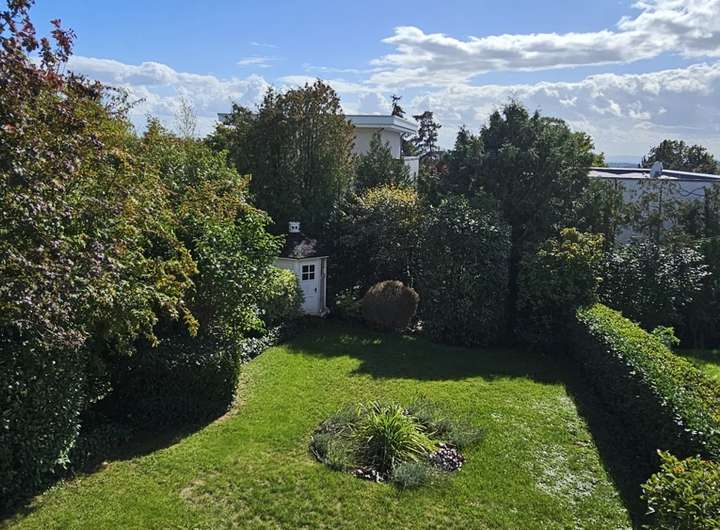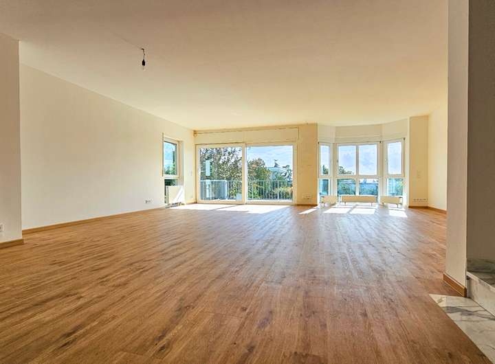 Neue, große Schiebefenster zu Balkon und Terrasse sorgen für viel Licht und schaffen eine offene Wohnatmosphäre. Natursteinböden, Einbauschränke, eine Sauna und eine Alarmanlage unterstreichen den gehobenen Charakter des Hauses.