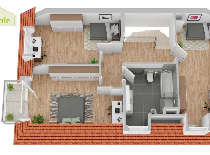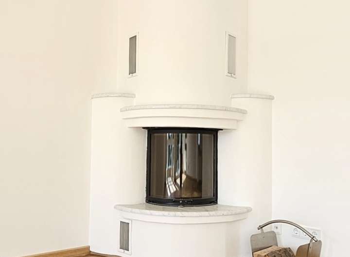 Im Erdgeschoss befindet sich ein großes Wohnzimmer mit Kamin und Zugang zu einem großen Balkon. Die Küche ist mit einer hellgrauen Einbauküche ausgestattet. Insgesamt verfügt das Haus über vier Schlafzimmer, zwei Bäder und ein Gäste-WC sowie zwei Balkone und eine Terrasse mit schönem Ausblick.