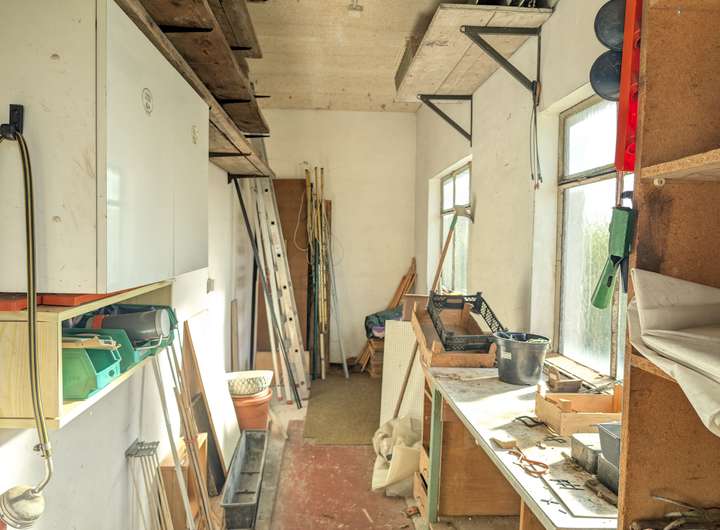 Eine Doppelgarage, eine Einzelgarage sowie eine Werkstatt runden das Angebot ab.