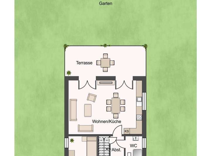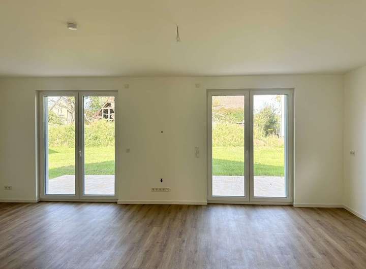 Geradezu öffnet sich der großzügige Wohn-, Ess- und Kochbereich mit einer Fläche von rund 38 m² – der ideale Ort zum Wohlfühlen und Verweilen. Die offene Wohnküche schafft eine harmonische Verbindung zwischen Kochen, Essen und Wohnen und führt direkt auf die sonnige Terrasse mit Blick in den gepflegten Garten.