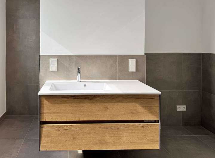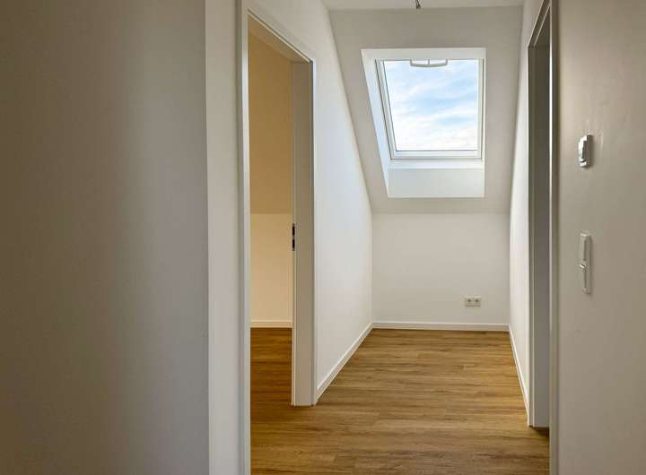 Beim Betreten des Hauses empfängt Sie ein zentraler Flur, von dem aus alle Räume im Erdgeschoss erreichbar sind. Auf der linken Seite befindet sich ein lichtdurchflutetes Zimmer, das sich ideal als Arbeits-, Gäste- oder Hobbyzimmer eignet. Rechtsseitig liegt der Hauswirtschaftsraum mit Anschluss für Waschmaschine und Trockner sowie der Haustechnik. Direkt daneben befindet sich ein modernes Tageslicht-Gästebad mit Dusche.