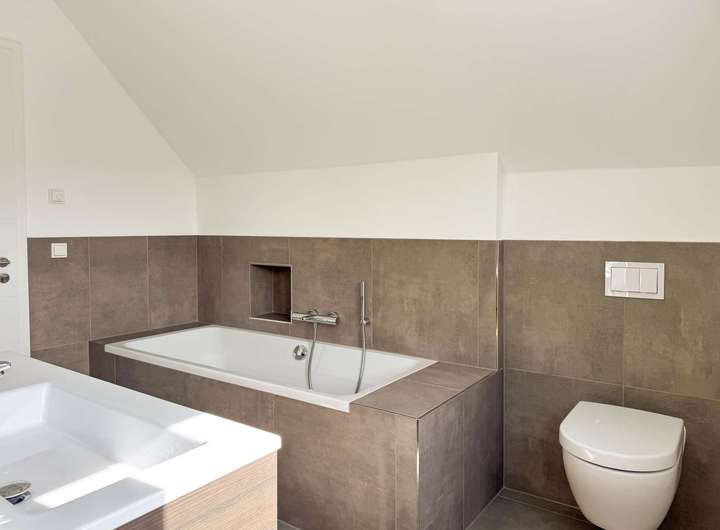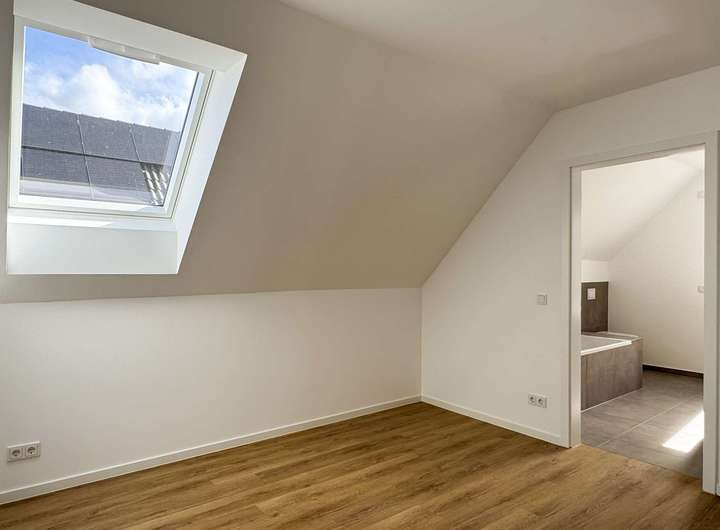 Über eine elegante Treppe gelangen Sie in das Obergeschoss. Hier befinden sich zwei helle Kinderzimmer sowie das Elternschlafzimmer mit begehbarer Ankleide. Das große Tageslichtbad ist mit einer bodengleichen Dusche und einer Badewanne ausgestattet – ein Ort zum Entspannen und Genießen.